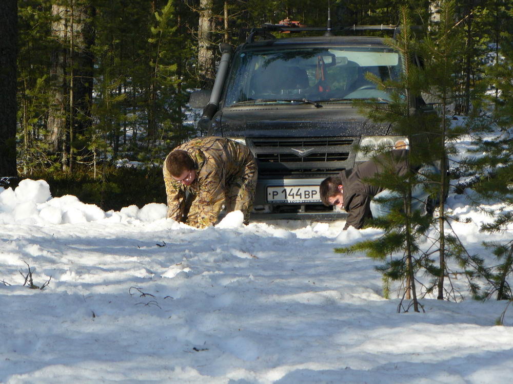 Почвы там песчаные. Причем, из крупного такого песка... Как только снег стает - станет сухо. Описанная выше дорога проезжаема на легковушке, но, похоже, это единственная такая дорога. Подъезд через Обжу, о котором я писала раньше "не работает" - Урал не проезжал до моста, поэтому и мы не доехали. Пробивать бампером снежную целину на УАЗе достаточно накладно по бензину ... да и не получается это делать быстрее, чем 2 км/ч.